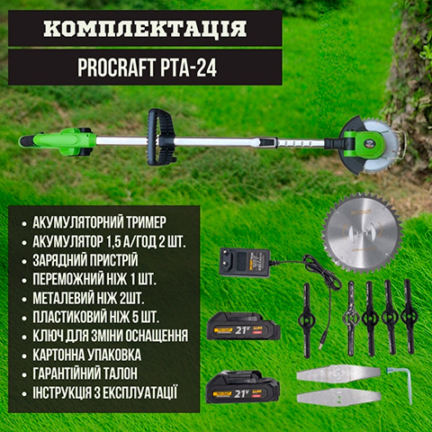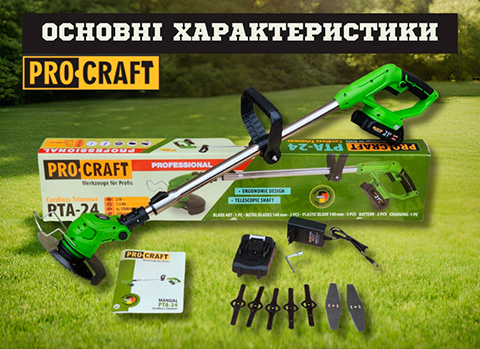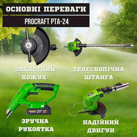 Акумуляторний триммер Proсraft PTA-24 ефективно скошує стебла бур'янів, високу траву та молоді пагони чагарників у тому числі на важкодоступних та нерівних поверхнях. Тример працює практично безшумно і не забруднює навколишнє середовище.